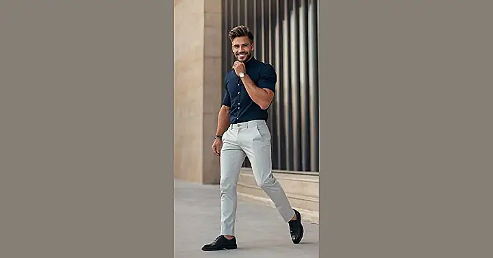 This guy looks like he just walked out of a magazine! He’s rocking a classic white shirt with those cool short sleeves. It’s like he’s saying, “I’m stylish, but I’m not afraid to be comfortable too!” And those tan pants? Let’s just say, they’re not your average dad jeans. They’re totally the kind of pants that make you want to get dressed up and go out, even if you’re just going to the mall. Plus, you can’t forget those awesome brown shoes!
