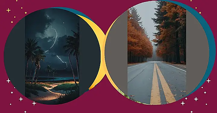 This picture is like a scene straight out of a cool movie. It’s got everything: tall palm trees swaying in the breeze, a sandy beach leading off into the distance, and a big, beautiful sky with a tiny sliver of a moon hanging out. But then, bam! Lightning cracks through the clouds, making the whole scene super dramatic and exciting. It’s like Mother Nature’s own personal light show.