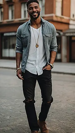 This guy’s outfit is a great example of how you can take a classic men’s clothing style, like a button-down shirt, and give it a modern twist. It’s a little bit daring, a little bit fun, and totally shows off his personality. It’s like he’s saying, “I’m a classic guy, but I’m not afraid to shake things up a bit.” You can never go wrong with a classic look, but adding a touch of personality can really make your style stand out!