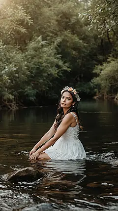 You’ve got to admire the commitment to the aesthetic! She’s sitting there, all graceful in her pretty dress, probably trying to look calm while secretly wondering if her hair will ever dry or if a rogue twig is about to tickle her toes. It’s the ultimate blend of ‘effortless beauty’ and ‘I hope my phone is waterproof.’ It just proves that for a truly memorable picture, sometimes you just have to dive in (pun intended!) and let the river add its own unpredictable, splashy charm to the whole wild and wonderful experience.