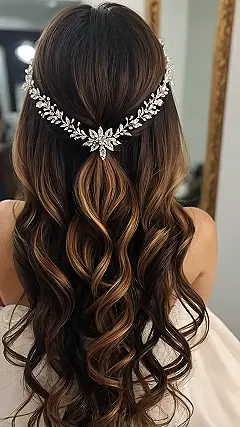 And seriously, look at that sparkly hairpiece! It’s like a crown but way cooler, sitting all fancy-like on top of the gorgeous half-up style. You’d probably feel like actual royalty walking around with hair this amazing, ready to wave to your adoring public (aka the wedding guests). Just try not to get *too* much confetti stuck in those perfect curls when it’s time to party!