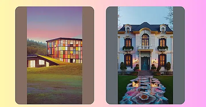 But wait, what’s with all the colorful glass? Is this a house or a disco ball? It’s like someone took all the crayons they could find and said, “Let’s decorate!” Maybe they are trying to attract aliens? Who knows, maybe they have a secret portal hidden in the basement, and the vibrant colours help them blend in. You never know what’s going on inside those big walls!