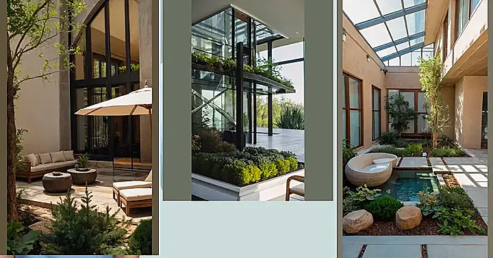 Imagine this: you’re chilling in your super-stylish house, but instead of just staring at walls, you’ve got your own personal rainforest right there in your living room! This image shows an indoor garden that’s seriously next level. It’s like someone took a peaceful courtyard and shrunk it down to fit inside, complete with comfy seating that looks like it’s made of giant seashells (because why not?). You could totally hang out here with your friends, read a book, or pretend you’re a super-rich explorer discovering a hidden jungle paradise.