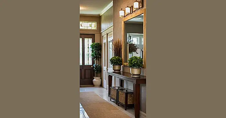 This hallway went from “blah” to “bam!” Just look at how a little decorating magic can transform a simple space. That gorgeous wood flooring? Perfection! And those gold accents – the mirror, the vase, the table legs – they add a touch of fancy without being too over-the-top. It’s like walking into a fancy hotel, but way more comfortable and less likely to find someone trying to sell you timeshares. Who needs a boring hallway when you can have a hallway that whispers “sophistication” (but in a friendly, welcoming way, of course).