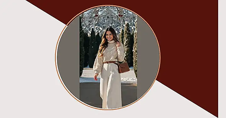 This outfit is the perfect blend of comfy and stylish – ideal for those chilly winter days when you want to look good without sacrificing comfort. Imagine strolling through a winter wonderland, bundled up in this creamy sweater and chic camel-colored trousers. The wide-leg pants are seriously flattering, and that chunky belt adds a touch of effortless sophistication. You’ll be ready to conquer snow days or impress your friends with your fabulous winter style!
