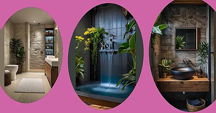 Imagine this: you’re stressed out from a crazy day at school, maybe a pop quiz went sideways, or you had a disagreement with a friend. Suddenly, you step into your bathroom – but this isn’t just any bathroom. It’s a mini rainforest spa! A waterfall cascades into a sleek, dark bathtub, surrounded by lush green plants and bright yellow flowers. It’s like taking a shower in a secret jungle paradise. Forget your worries, this is where relaxation becomes reality! This nature bathroom decor is seriously next-level awesome.
