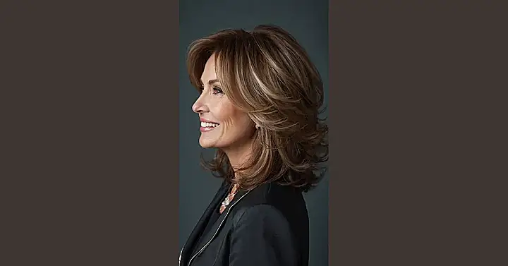 This picture shows a woman rocking a seriously awesome layered haircut! It’s like a waterfall of gorgeous, flowing hair – think less “helmet head” and more “head-turning fabulous.” This style is perfect for women over 50 because it adds volume and movement without looking fussy or too try-hard. It’s the kind of haircut that makes you feel confident and ready to conquer the world, or at least, conquer that next episode of your favorite show.
