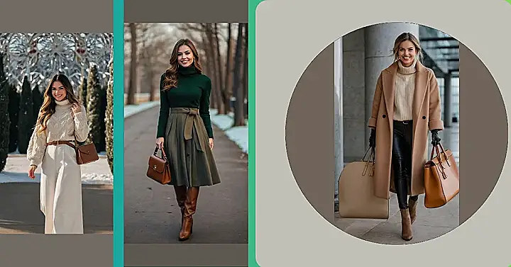 This outfit is seriously chic! Imagine strolling through a snowy park, looking effortlessly stylish in this gorgeous green turtleneck and pleated midi skirt. It’s like a modern fairytale – all cozy knits and elegant lines. Pair it with some brown boots, a cute handbag, and you’re ready to conquer winter fashion. No more shivering in style – this look is both warm and absolutely on-trend!