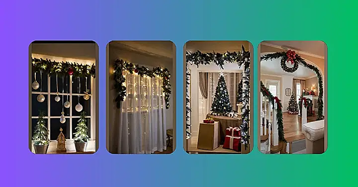 This picture is pure Christmas magic! Imagine snuggling up inside on a chilly evening, watching the twinkling lights dance across the sheer curtains. It’s like a little window into a fairytale winter scene, all cozy and warm. That garland draped across the top, with its mix of sparkly ornaments and pine branches, is the perfect touch—it’s festive without being overwhelming, just like the best indoor Christmas decorations should be!