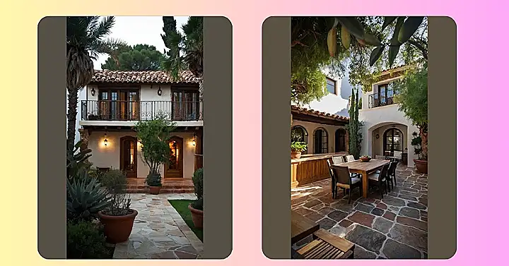 Picture this: you’re lounging in a Spanish Mediterranean home, the sun warming your face as you sip something refreshing. This isn’t just any house; it’s a dreamy courtyard oasis, complete with terracotta pots overflowing with plants, arches that whisper tales of old Spain, and a patio made of stones that look like they’ve been sun-baked for centuries. You could almost imagine flamenco dancers suddenly bursting into a performance right there in the middle of your delicious lunch, but for now, you’ll stick with the incredibly tasty paella!
