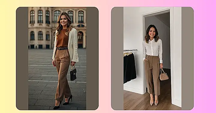 That outfit is seriously chic! It’s like a grown-up version of your favorite comfy pants and a crisp white shirt. Picture this: you’re acing that presentation at school, but instead of jeans, you’re rocking these stylish taupe trousers and a perfectly ironed white blouse. Suddenly, you’re not just prepared – you’re *stylishly* prepared! And the cute handbag? That’s just the cherry on top of your awesome work outfit.
