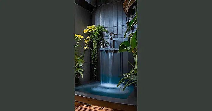 Seriously, who needs a boring old shower when you can have a personal waterfall? This is way better than any video game; it’s like nature created a custom spa just for you! The dark tiles make the plants and water pop, and the yellow flowers add a splash of sunshine. It’s the ultimate way to unwind and feel connected to the outside world, even if you’re stuck inside doing homework. It’s the perfect place to forget about algebra and just breathe.