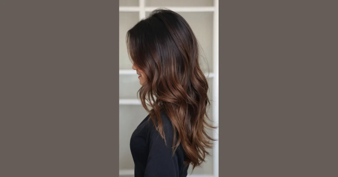 This image shows a gorgeous model with hair that’s like a warm, yummy caramel latte – perfect for fall! It’s a rich brown with some lighter streaks that make it super-dimensional. Imagine walking into school with this hair color – you’d be turning heads for sure!