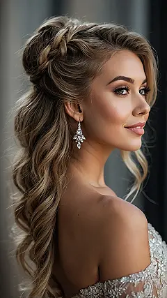 Prom is basically a mission to find the perfect balance between looking amazing and not tripping over your own feet, right? And hair? Don’t even get me started. Do you go full fancy updo and feel like a queen who can’t look down, or let it all hang loose and pray a gust of wind doesn’t turn you into a walking bird’s nest? This is where the ‘half up half down’ style swoops in like a superhero! It’s the ultimate compromise, letting you rock some sophisticated action up top, like the cool braided crown you see here, while still letting your hair do its gorgeous wavy thing down your back. It’s like telling your hair, “Okay, you can be classy *and* ready to party.”