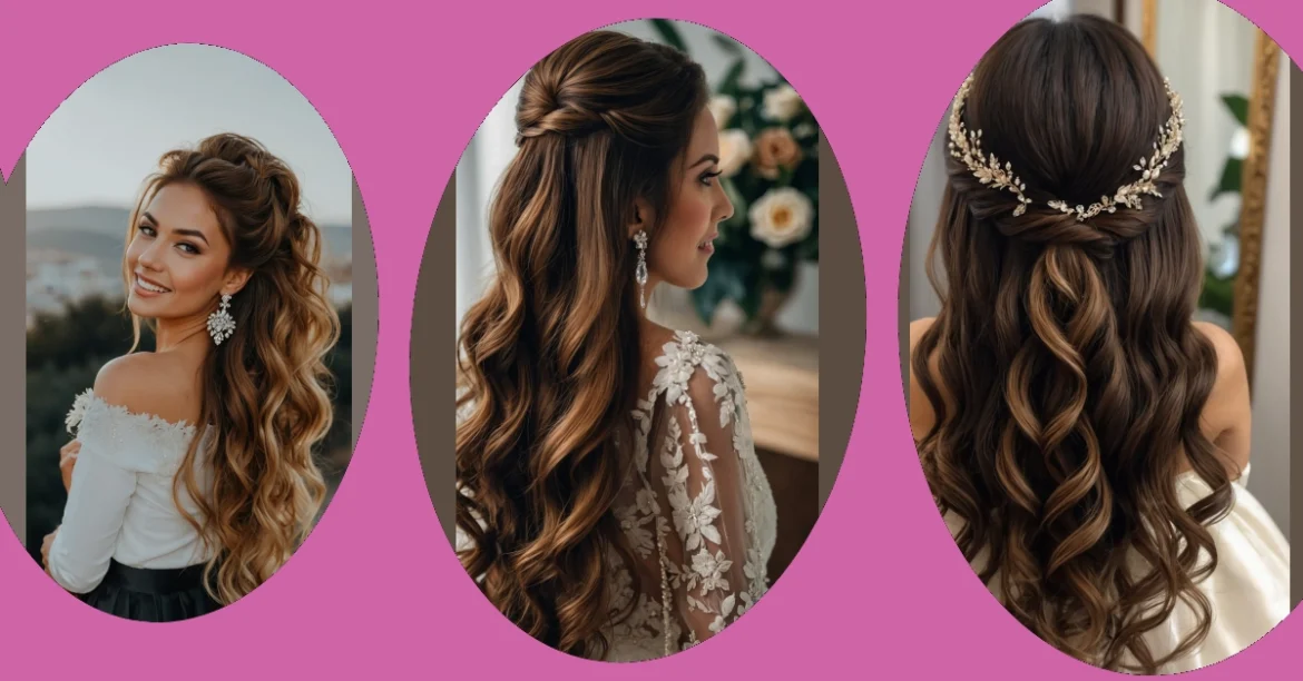So you’re heading to a big fancy event, maybe even walking down the aisle, and you’ve got to decide what to do with your hair. Trying to look super elegant but also, you know, like yourself? That’s where the half-up, half-down hairstyle totally saves the day! It’s like saying, “I’m fancy, but I can still totally headbang if the right song comes on.” This style, like the stunning one in the picture with all those gorgeous waves flowing down, gives you that polished vibe with the hair pulled back from your face, letting everyone see your awesome smile and maybe some sparkly earrings, while still letting the rest of your hair do its bouncy, beautiful thing.