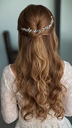 Trying to pick a wedding hairstyle can feel like a super intense mission, but this half-up look is basically your secret weapon for looking absolutely flawless. Check out how those top sections are gently pulled back, making a perfect stage for that totally dazzling hairpiece! It’s like your hair is wearing its own tiny, sparkly crown, decked out with pearls and crystals that would make any fairy tale jealous. And don’t even get us started on those amazing, bouncy waves cascading down – they’re practically doing a happy dance all on their own, making sure you look effortlessly stunning without a single hair out of place (well, mostly!).