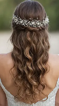 Trying to pick a wedding hairstyle can feel like a super intense mission, but this half-up look is basically your secret weapon for looking absolutely flawless. Check out how those top sections are gently pulled back, making a perfect stage for that totally dazzling hairpiece! It’s like your hair is wearing its own tiny, sparkly crown, decked out with pearls and crystals that would make any fairy tale jealous. And don’t even get us started on those amazing, bouncy waves cascading down – they’re practically doing a happy dance all on their own, making sure you look effortlessly stunning without a single hair out of place (well, mostly!).