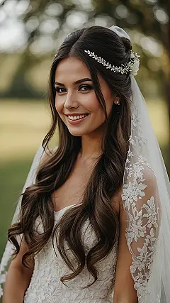 Stepping into the spotlight on your big day means your hair needs to be ready for its close-up, and this style is totally acing the assignment! The way those beautiful waves flow down, while the top half is elegantly pulled back, gives off major “I woke up like this, but better” vibes. Plus, that super sparkly, leaf-inspired hairpiece isn’t just a pretty accessory; it’s basically giving your hair a fancy tiara, making sure you shine from every angle – no filter needed! It’s the kind of classic bridal look that’s both stunning and probably won’t get tangled in your wedding cake.