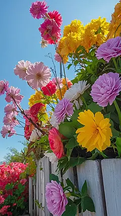 Wow! Look at this explosion of color! It’s like a rainbow threw up on a fence – in the best way possible! These beautiful, tranquil flowers are seriously putting on a show. Imagine having this vibrant, happy scene greet you every morning. It’s a total mood booster, right? Who needs a fancy vacation when you’ve got this much beauty in your backyard? Maybe a tiny garden gnome could join the party, though…just sayin’!