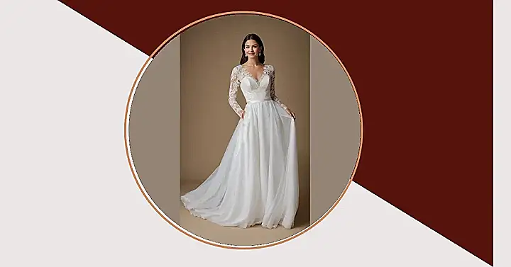 This dress is basically saying, ‘Move over, Cinderella, there’s a new fashion icon in town!’ From the gorgeous off-the-shoulder design to the delicate lace patterns tracing all the way down the sleeves, every detail is on point. You could practically do a dramatic movie-style spin in this skirt and not hit anyone (maybe!). It’s the perfect blend of classic charm and modern cool, proving that wedding dresses with sleeves can be totally stunning and super comfortable, letting you dance the night away without any wardrobe worries. Who knew sleeves could be so effortlessly glamorous?