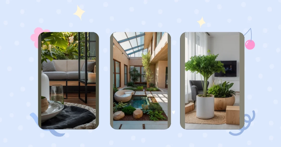 Imagine this: you’re chilling in your super-stylish house, but instead of just staring at walls, you’ve got your own personal rainforest right there in your living room! This image shows an indoor garden that’s seriously next level. It’s like someone took a peaceful courtyard and shrunk it down to fit inside, complete with comfy seating that looks like it’s made of giant seashells (because why not?). You could totally hang out here with your friends, read a book, or pretend you’re a super-rich explorer discovering a hidden jungle paradise.