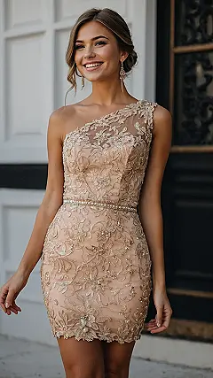 Get ready to shine brighter than a supernova at homecoming with this dazzling dress! Just look at all those intricate sparkles and the super chic one-shoulder design – it’s like a party exploded in the best way possible. This isn’t just any homecoming dress; it’s practically a secret weapon for looking effortlessly amazing while still being able to bust a move without tripping over a long train. You’ll be the person everyone secretly wishes they had a dress just like, all while wondering if you actually have a personal stylist hidden in your backpack.