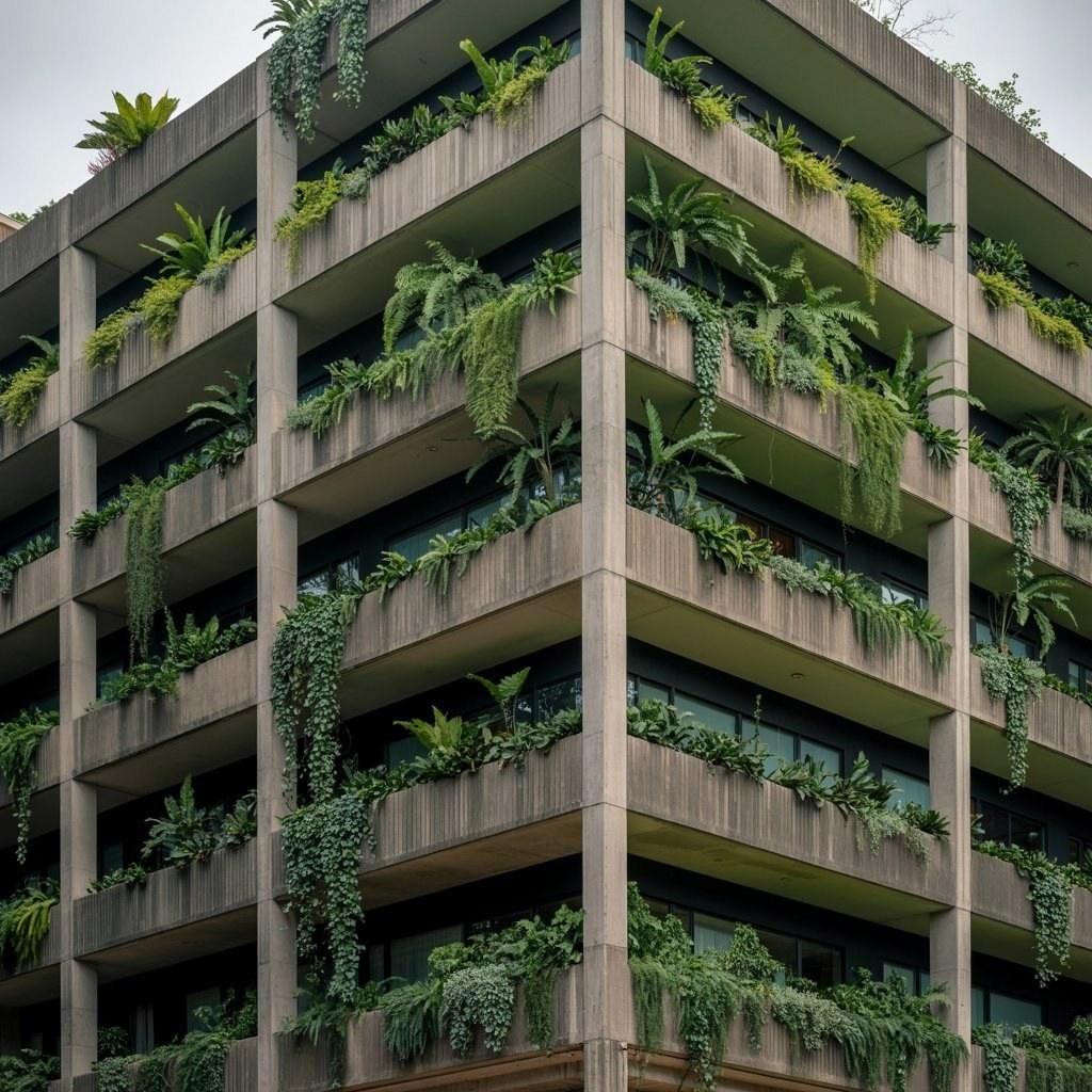 Experience the striking contrast of Brutalist Architecture Buildings softened by overflowing planted balconies. Trailing vines and tropical foliage cascade down, bringing life and color to the modern flat building design.