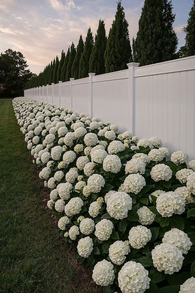 Create a sophisticated curb appeal with a luxurious white hydrangea front yard landscape. This big garden design features elegant white hydrangeas and clean white fencing for a striking, low-maintenance look.