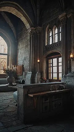 This picture is like stepping into a fairytale! Imagine you’re a knight or princess (or maybe even a dragon!) hanging out in this old-timey castle. The stone walls and arched ceilings are super cool, and the light coming through the windows makes it feel like a secret hideaway. It’s a little bit mysterious, but also really inviting – like the kind of place where you could relax and forget about your worries for a while.