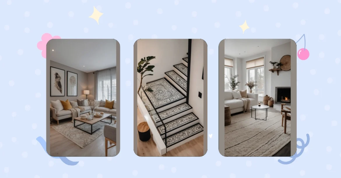 Honestly, this staircase is giving off major ‘I’m chic, but I’m also really good at making your house feel chill’ vibes. That massive green plant isn’t just there for decoration; it’s probably breathing extra oxygen to help you get up all those steps without getting winded. And check out the glass railing – super modern, but also handy for peeking down to see if your sibling stole the last snack. It’s the kind of spot where even doing chores like vacuuming the stairs feels less like a chore and more like a scenic tour through your surprisingly stylish Nordic-inspired home. Plus, those patterns? They’re practically begging you to take a cool photo for your Insta feed.