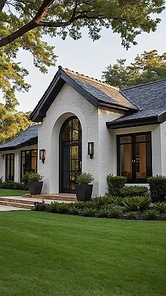 That arched front door isn’t just an entrance; it’s basically a fancy portal inviting you to a world of comfy couches and maybe a secret snack stash. Those cool lanterns flanking the door look like they’re ready for a party, and all the green plants aren’t just for show – they’re probably whispering secrets about how awesome it is to live here. This isn’t your grandma’s ranch house (unless your grandma is super hip and lives in a modern masterpiece!). It’s the kind of place where you could chill after school, kick back, and feel totally at home, probably without even having to do the dishes.