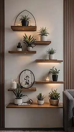 But let’s be real, those plants aren’t the only superstars here. Check out those super cool floating shelves, lit up like tiny spotlights! They’re basically giving your prized possessions – whether it’s a cool candle, a funky mirror, or that one picture where you look surprisingly good – their moment in the spotlight. This setup shows how apartment decorating can turn plain walls into an art gallery of your favorite stuff, making your space feel totally unique and way more grown-up than just shoving everything under your bed. Who knew organizing could look this awesome and make your apartment feel so much more ‘you’?