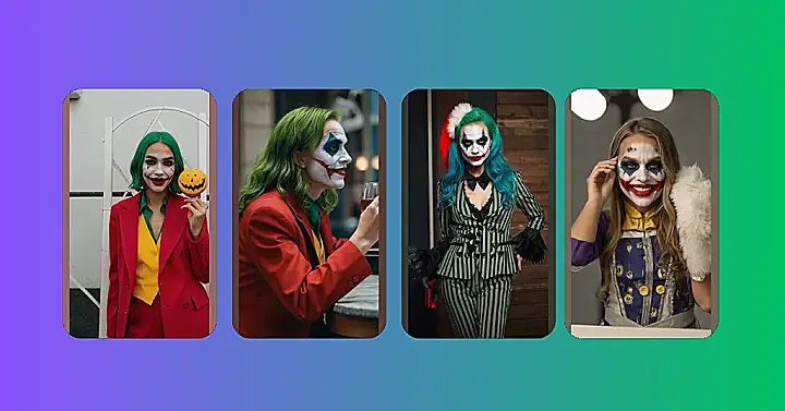This picture shows a woman rocking a super cool Joker costume. She’s got the iconic white face paint with a big red smile, but she’s put her own spin on the look. Her bright blue hair and sassy striped suit give her a fresh, modern vibe. She’s totally channeling the Joker’s chaotic energy without looking scary. Her look is like a mix of funny and cool, like a joke that’s actually kind of clever! You could definitely rock this costume at a Halloween party or a comic book convention.