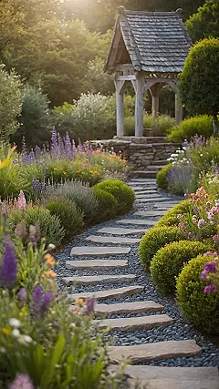 You can practically imagine little garden creatures having the time of their lives hiding among the colourful bushes near the stone path. Forget those gardens where everything is perfectly lined up like scared soldiers; this place has personality, like the flowers are telling jokes and giggling amongst themselves. It proves that sometimes the best things happen when you just let nature freestyle a bit, creating a super inviting explosion of colour that looks like it was grown with sunshine and happiness, maybe mixed with a little bit of delightful chaos.