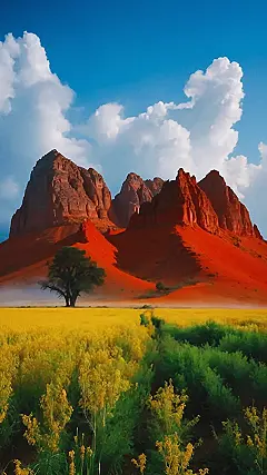 This picture makes me feel like I’m in a magical world. Imagine you’re walking through this field. You can almost feel the soft grass beneath your feet and smell the sweet scent of the yellow flowers. The giant red mountains look like they’re about to melt, and the sky is so big it seems like you could reach up and touch the clouds. It’s like something straight out of a fairytale!