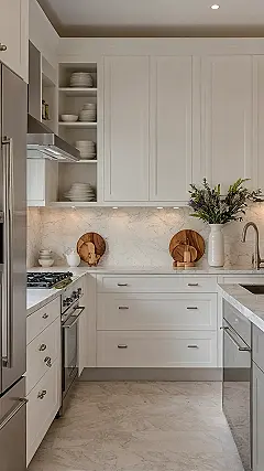 This kitchen looks so ridiculously clean and perfect, you’d probably feel guilty even *thinking* about making a mess in it. With those sparkling white cabinets and fancy marbled countertops, it’s like a supermodel kitchen – gorgeous, a little intimidating, and definitely not built for your average spaghetti night disaster. You just know that if a single crumb dared to fall, it would immediately get picked up by an invisible, highly trained crumb-squad.