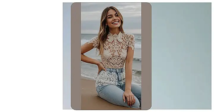 Plus, who looks this effortlessly cool while sitting on the sand in a full lace top outfit? It’s like she’s challenging the ocean to a style-off and winning! The detailed lace on her top and even those matching denim accents are totally chic, making us all wonder if we should ditch our hoodies for something a bit more… elaborate next time we hang out. Just remember to pack a lint roller for all the stray sand that might cling to those gorgeous lace patterns. Because looking fabulous is great, but nobody wants a crunchy wardrobe!