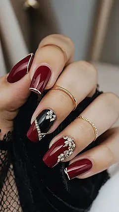 These nails are like a fancy French manicure went on a fall foliage adventure! They’re all decked out in rich, burgundy red, and they’ve got these cute little black and gold accents that look like they just fell from a tree. It’s the perfect way to show off your love for fall without looking too serious.