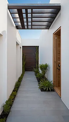 This garden is all about keeping things simple and stylish! It’s like the design told the plants, “Alright guys, just chill out in a line, don’t go crazy.” You’ve got the cool gray pathway, the white walls that make everything pop, and just enough greenery to say, “Yeah, I’m a garden, but I’m not trying too hard.” Perfect for people who want a nice-looking space without spending their whole weekend wrestling weeds.