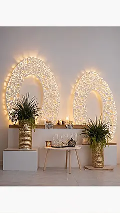 Check out this room that decided to go all out with its decor! Those huge, glowing oval things on the wall? They look like super fancy, oversized art pieces, or maybe even portals to another dimension that just happen to glow perfectly. They’re definitely stealing the show, aren’t they? Instead of just regular old lamps, these artistic light fixtures are basically screaming, “I’m not just decor, I’m a *whole vibe*!” Paired with those shiny gold planters holding spiky green plants, it’s like this room is ready for a red-carpet event, or at least a really chill hangout session with extra good lighting for your selfies.