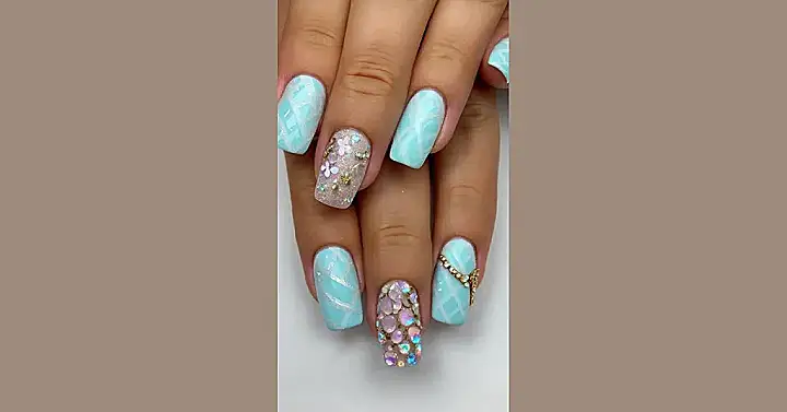 Think of it this way: the light blue is the chilled-out vibe, like a cool ocean breeze, and the sparkly gold bits are the unexpected treasures you find while beachcombing. It’s basically summer vacation, but on your hands. Now, all you need is a matching phone case and you’re officially cooler than the other side of the pillow.