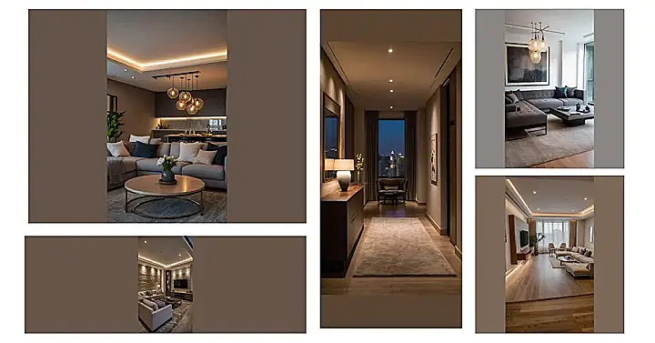 Forget those sad, single lightbulbs trying to light up an entire universe, because this living room went all out! Check out that awesome wall art, secretly housing a bunch of lights that aren’t just for seeing where you’re going (though that’s a bonus, no more stubbed toes in the dark!). It’s like the room got a super stylish glow-up, making those incredibly comfy-looking couches practically begging you to flop down. Who needs an epic sunset when your living room can shine this bright and cool, all by itself, turning every evening into a well-lit adventure?
