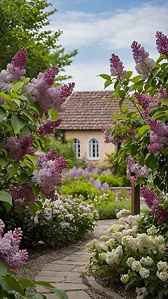 This lilac garden landscape looks totally ready for a floral fiesta! The lilac bushes are practically showing off, piling on the purple and white blooms like they’re competing for best in show. It’s like the garden is waving hello with big, colourful bouquets everywhere you look, especially along that winding path. You could easily get lost just admiring all the fluffy flower clusters, turning a regular walk into something way more vibrant and fun than staring at your phone.