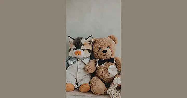 Behold, the ultimate power couple of the plush world! On the left, we’ve got a seriously stylish foxy-cat sporting a denim shirt layered over a pristine white romper, complete with an adorable little orange nose. He looks ready to drop a new album or maybe just casually win ‘best dressed’ at the annual toy gala. Beside him, our classic teddy bear is looking dapper in his bow tie, giving off major ‘I’m with the band’ vibes, holding a little bouquet that probably cost a fortune in tiny flower currency. These two are clearly here to show us how to be both effortlessly cool and ridiculously cuddly at the same time.