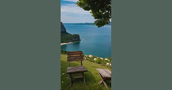 Imagine this: you’re chilling on a rustic wooden chair, feeling the gentle breeze on your face. The view? Absolutely stunning! Crystal-clear turquoise water stretches out as far as the eye can see, framed by lush green hills and a rocky coastline. It’s like a postcard, but way better because you’re actually *there*, living your best life and maybe even trying to catch a few rays. This picture screams “beautiful tranquil places,” and honestly, I wouldn’t mind spending a whole summer vacation here – maybe with a really good book and a big sun hat!