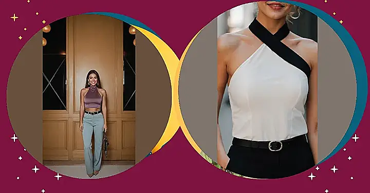 Let’s talk about those light blue wide-leg pants – they’re basically a comfy cloud disguised as fashion. You could probably do a full dance routine in them without a single wardrobe malfunction, or at least sneak in an extra snack without feeling squished. Paired with that cool belt and its shiny gold buckle, this whole halter top women outfit shows you can be super trendy and totally comfortable at the same time. It’s so versatile, you could wear it to a fancy dinner or swap the heels for sneakers and become the queen of the casual cool look. Now that’s what we call a power outfit!
