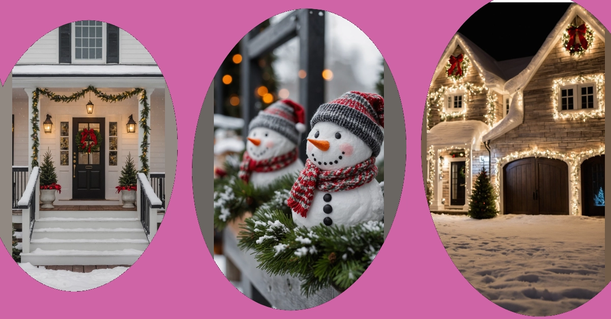 Walking up to this house must feel like stepping right into a Christmas card, especially with all that fresh snow making everything sparkle! The front porch is absolutely showing off with its fantastic outdoor Christmas decorations. Twinkling lights are woven through lush green garlands, practically hugging the pillars and the entryway, making you wonder if the elves had a contest for who could string the most festive lights without getting tangled. It’s so inviting, you almost expect to hear sleigh bells jingling or perhaps the faint sound of carolers whose boots haven’t quite made it up the snow-covered steps yet.