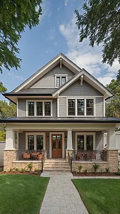 And check out the rest of the place! The cool gray siding and the natural stone base make it look super solid, like it could totally survive a rogue frisbee or even a surprise pop quiz landing on the roof. That pathway leading up to the door is perfect for making a grand entrance or perhaps a quick escape. This is the kind of American house design that just feels welcoming and ready for all sorts of good times.