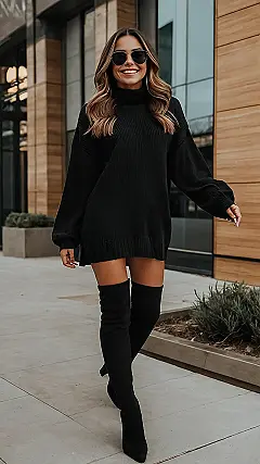 This outfit is the perfect example of how to rock a black sweater dress without looking like you’re heading to a funeral! The model is totally owning those over-the-knee boots; it’s like she’s ready to conquer the world, one stylish step at a time. And the sunglasses? Pure boss-babe vibes. It’s comfy, it’s chic, and it proves that sometimes, less is definitely more. Think of it as the ultimate “effortlessly cool” look – you know, the one that makes people think you spent ages getting ready, when really, you just threw it on and looked amazing.