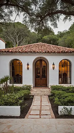 If ‘cozy’ and ‘cool’ had a baby, it would probably look exactly like this small hacienda-style home! Its super bright white walls and those terracotta roof tiles practically glow, begging you to kick off your shoes and relax. Those sturdy wooden doors and windows, complete with their fancy iron grilles, aren’t just for looks; they whisper tales of sunny afternoons and maybe a hidden treasure chest (a snack drawer, probably). It’s the perfect size – not so big you get lost, but big enough for all your epic ideas, like finally perfecting that TikTok dance without bumping into furniture.